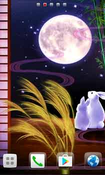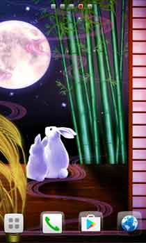 縁側で月見を楽しむ真っ白な兎。懐かしい雰囲気が漂う和風幻想ライブ壁紙☆