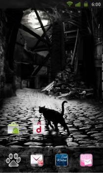 荒れ果てた廃墟は黒猫の住み家。月明かりに影を伸ばす黒猫のモノクロデザイン。